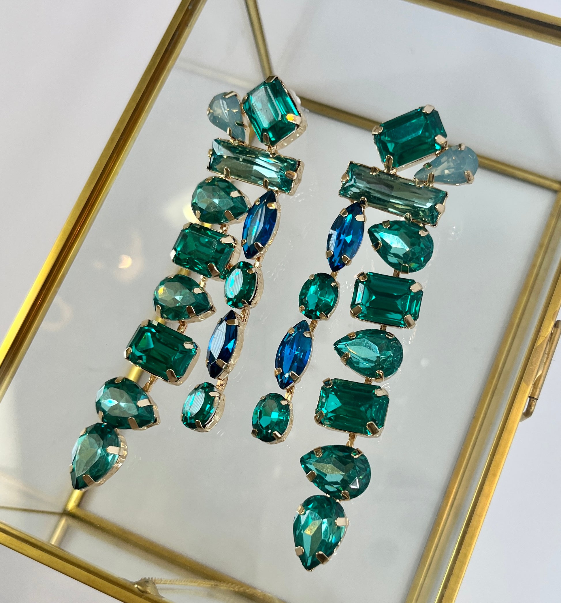 Ari Rhinestone two tone peacock green earrings are eye catching with a striking blend of sophistication and modern flair.