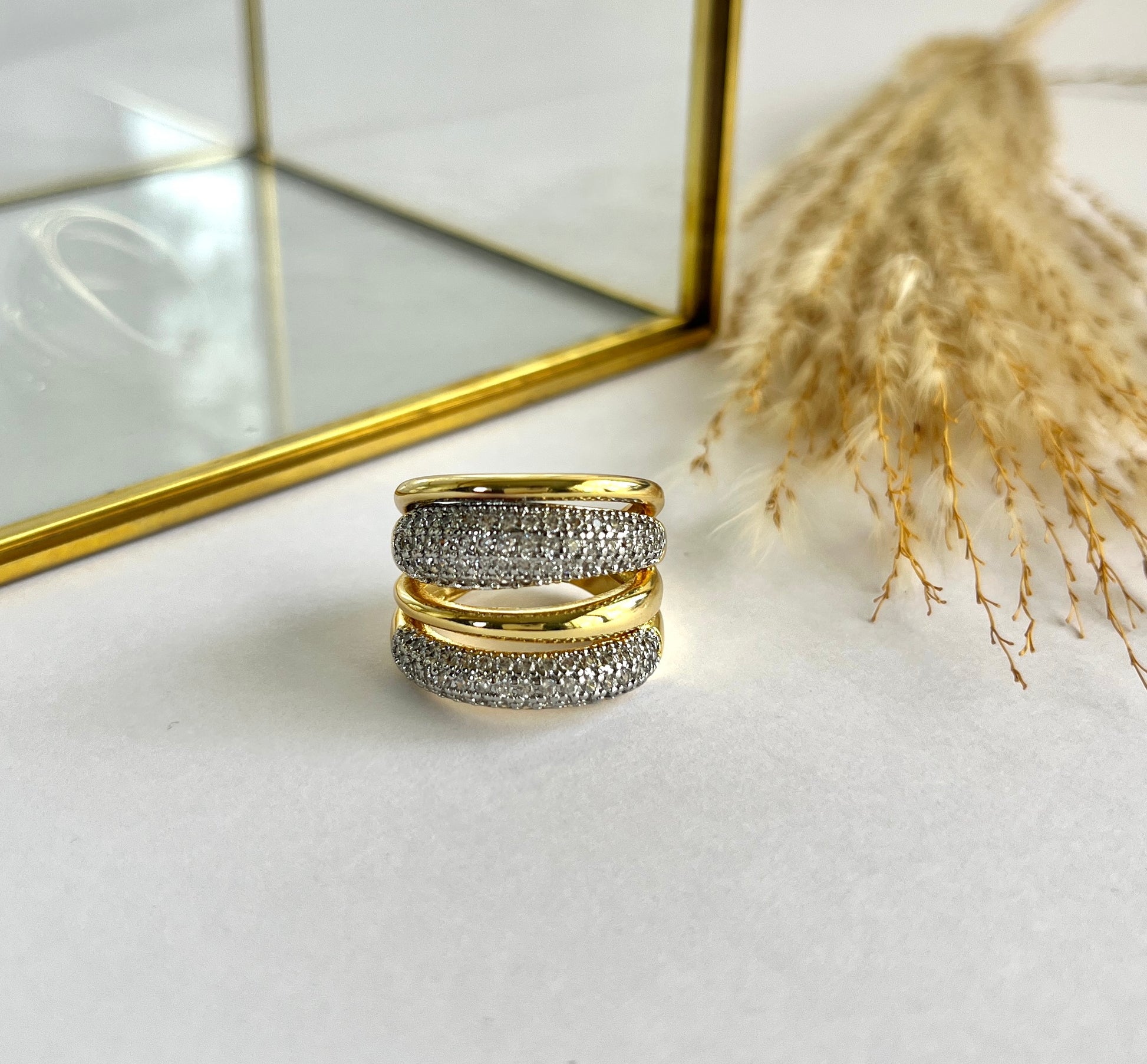 Forever Stacked Adjustable Ring is a stunning gold tone piece with shimmering rhinestones multiple stacked.