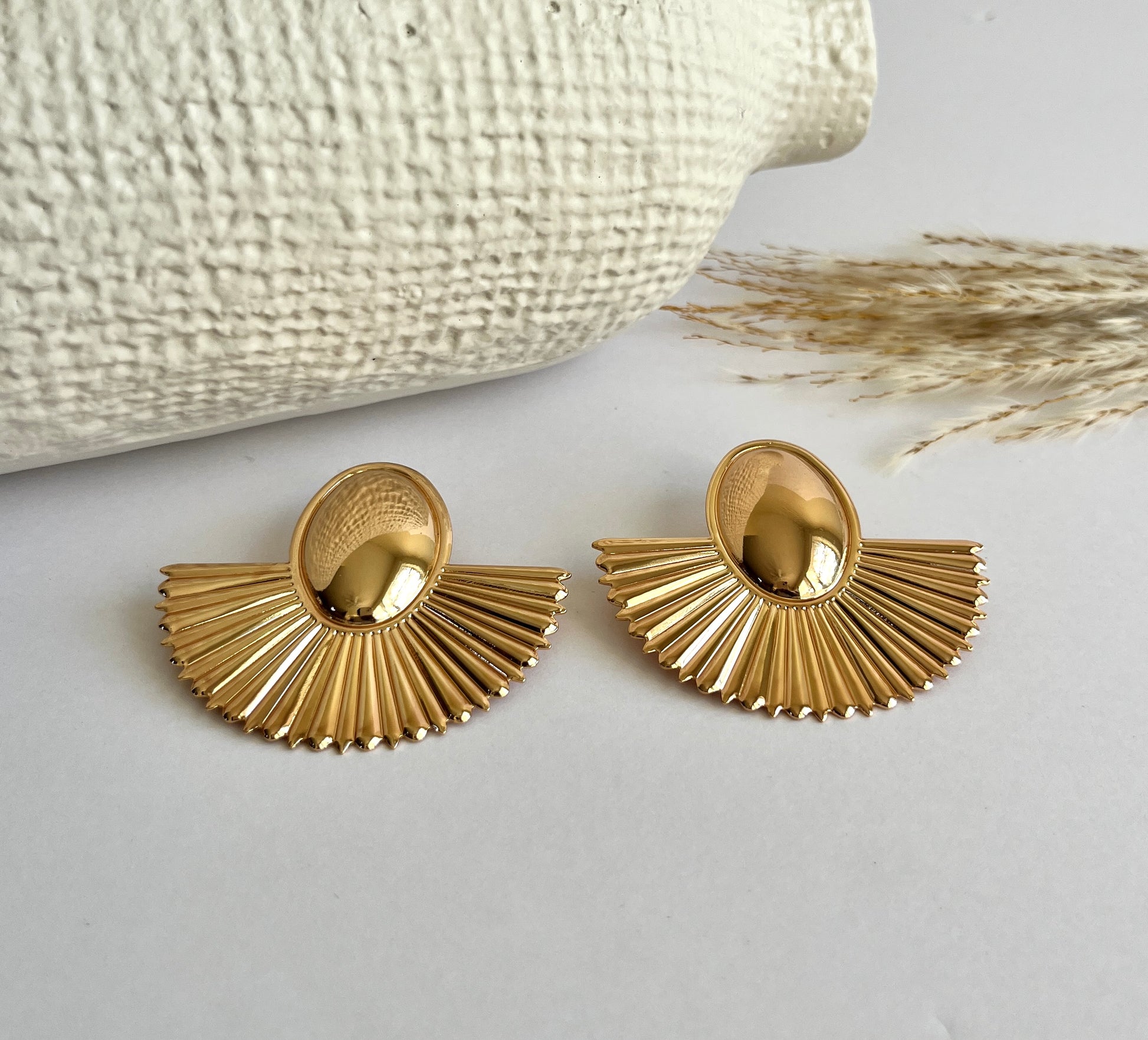 Golden hour is a fan-like sunburst earring, such a stud for brunch or ladies night.