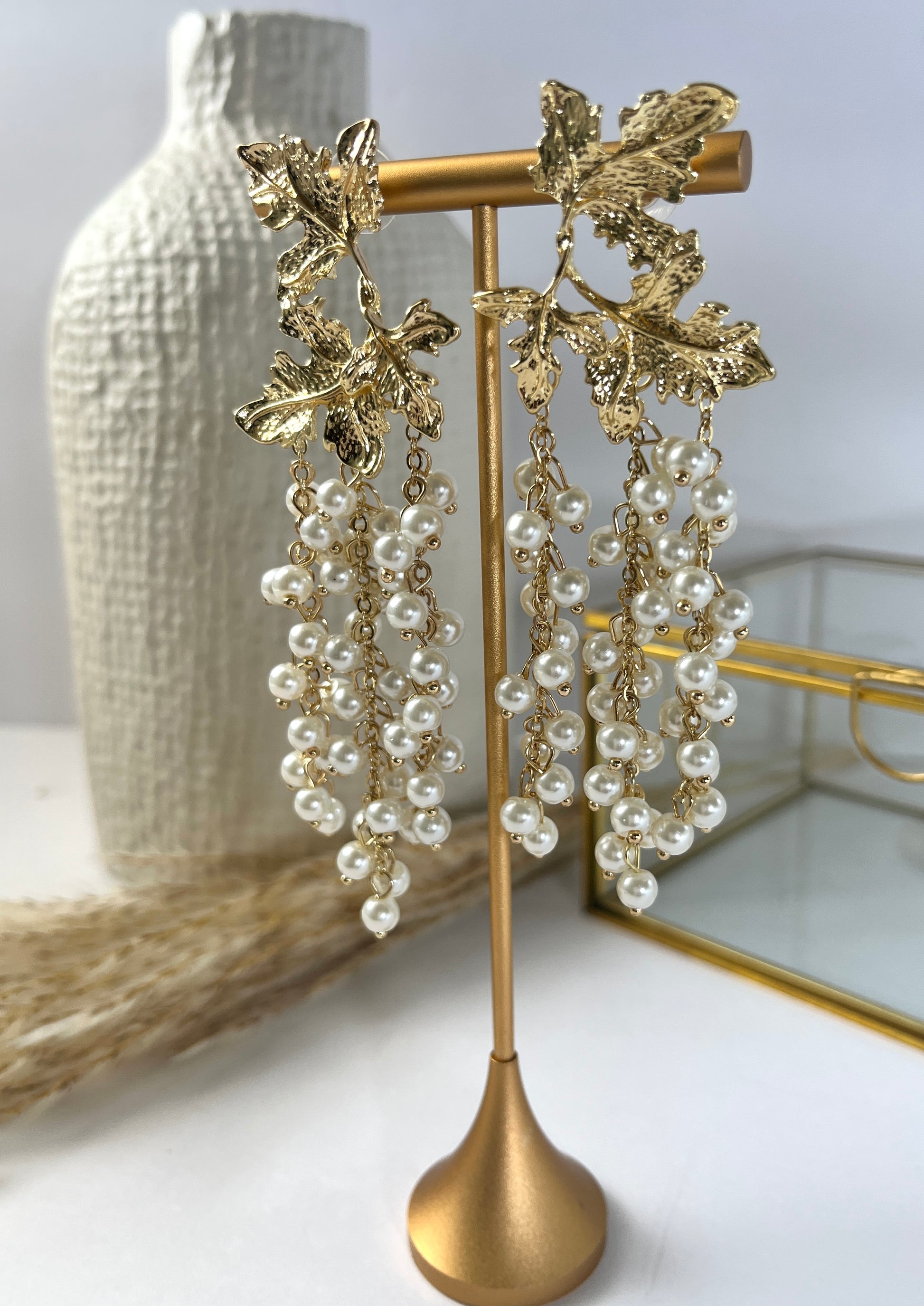 A leaf-shaped pendant earring with a cluster of drop pearls.