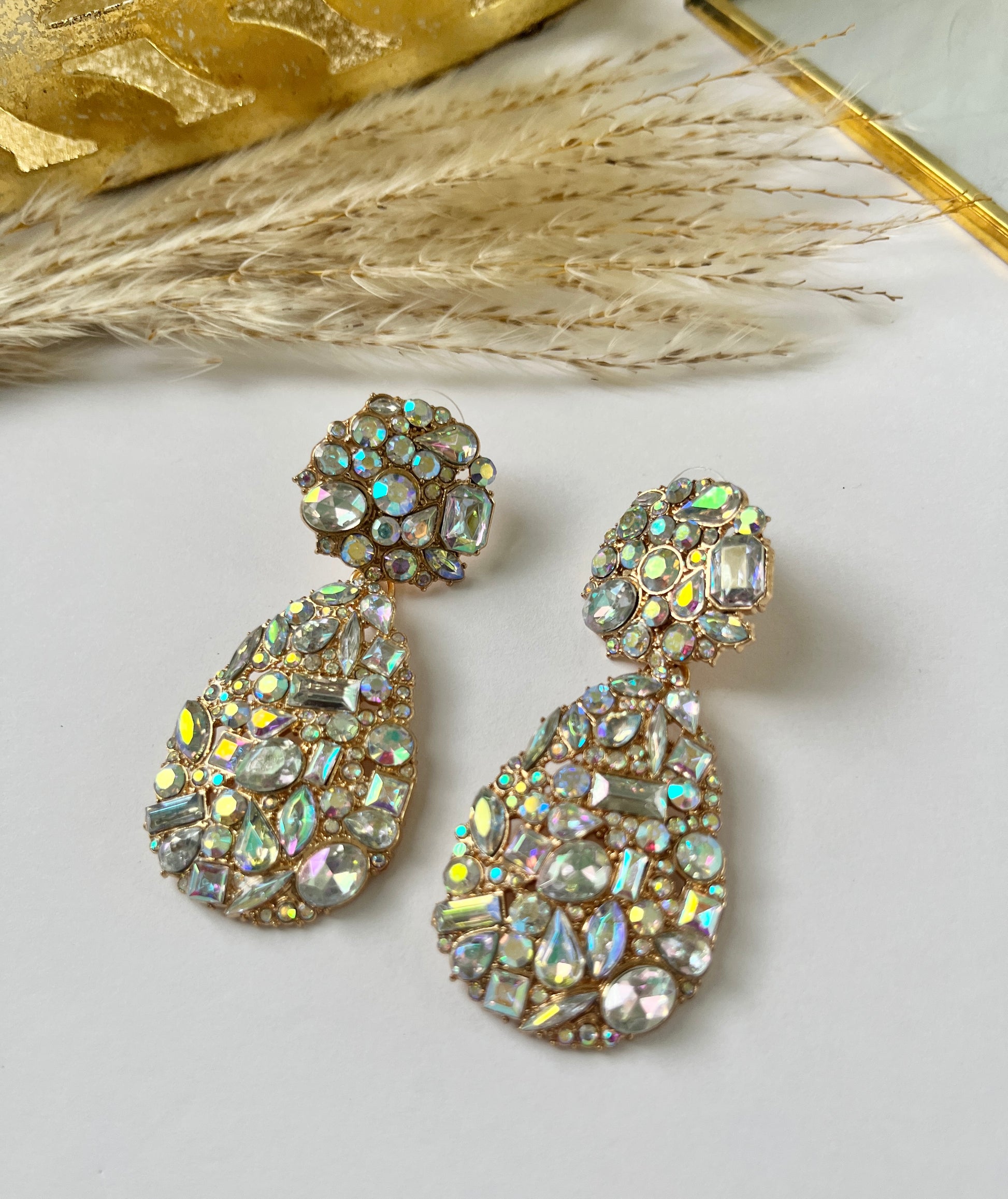 The Jade Bling Earrings are elegant statement pieces featuring polished jade stones set in a sparkling frame.